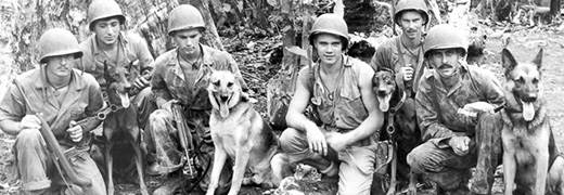 Marines in a Bougainville Jungle clearing wait an assignment to ferret out Japs with the aid of their dog partners in Bougainville, March 24, 1944. The dogs locate the enemy and the Devil Dog marines clean them out. The Marines left to right are: Pvt. Carl Robertson, Malden, Mass.; Pfc. Nick Barack, Masontown, PA.; an unidentified Marine; Pvt. Mravin R. Troup, St. Louis; Pfc. Robert Forsyth, Stamford, Conn.; and Pfc. Rufus G. Mayo, Montgomery, Ala. The dogs are left to right Jack, an unidentified German shepherd dog, Otto and Caesar. Caesar is reported to be the first dog wounded in this war, but has returned to duty. (AP Photo)