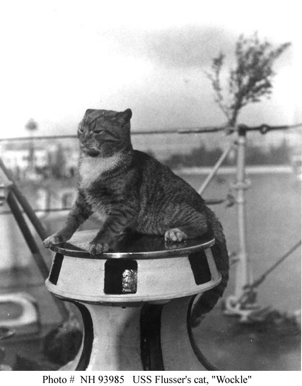 Clockwise:  1. Ship’s cat, HMS Queen Elizabeth, Gallipoli Peninsula, 1915, 2. USS Flusser’s cat, “Wockle” 3. Ship’s cats “inspect” the breech of a 4-inch gun aboard an unidentified US ship. 4. Togo, ships cat aboard the HMS Dreadnought,