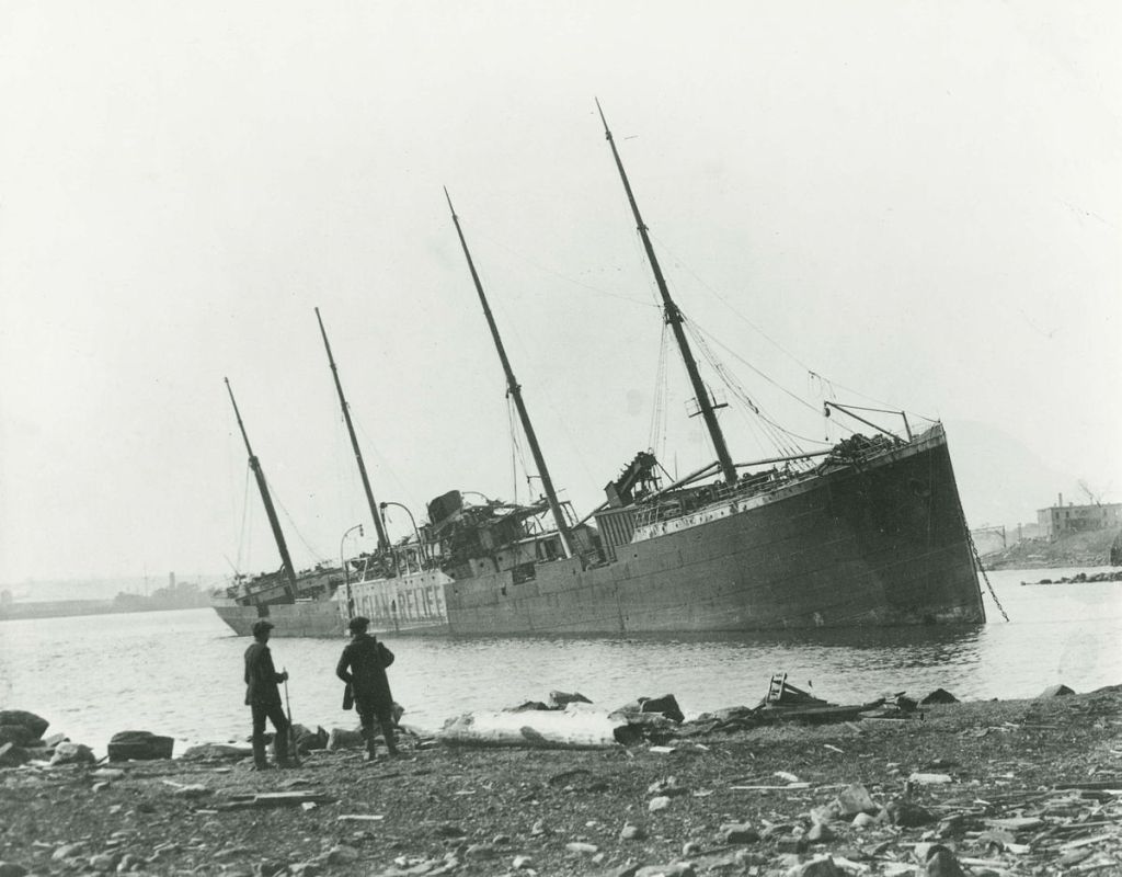 As might be expected, the pyrotechnic spectacle put on by the flaming ship was too much to resist, and crowds gathered around the harbor. The high-pitched scream emitted by picric acid under combustion is a principal feature of fireworks displays, to this day. You can only imagine the scene as the burning freighter brushed the harbor pier setting that ablaze as well, before running herself aground.