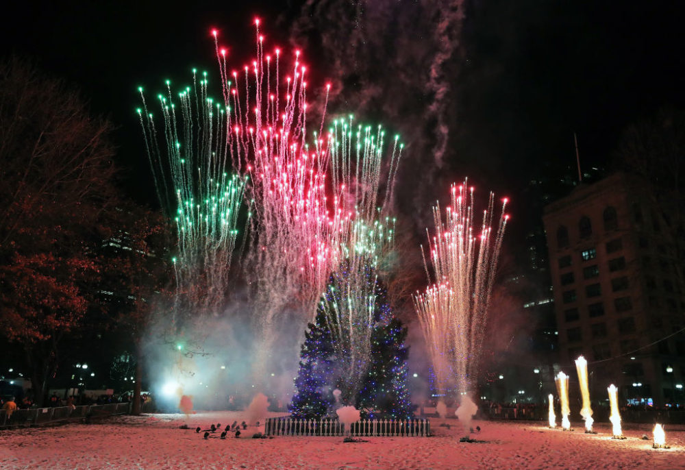 BOSTON, MA – DECEMBER 5: Fireworks explode around the Christmas tree on Boston Common at the conclusion of the festivities at the 78th annual tree lighting at the Boston Common on Dec. 5, 2019. (Photo by Jim Davis/The Boston Globe via Getty Images)