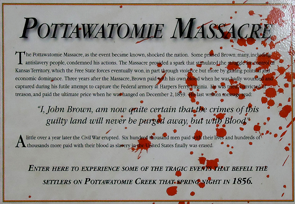 Brown supporters blamed the 1856 massacre on everything from defending the honor of the Brown family women, to self defense, to a response to threats of violence from pro slavery forces. Free Stater and future Kansas Governor Charles Robinson may have had the last word when he said, “Had all men been killed in Kansas who indulged in such threats, there would have been none left to bury the dead.”