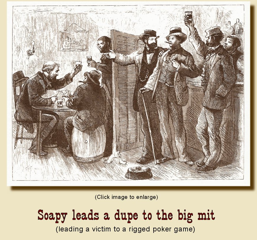 In January 1848, a carpenter and sawmill operator named James Marshall discovered gold on the American River near Coloma, California. Some 300,000 flocked to the “Golden State” over the next few years from the United States and abroad, in search of fortune. For most, the “California Gold Rush” was tedious, dirty and difficult work. For Jefferson Randolph “Soapy“ Smith and his merry band of grifters, it was easier simply to fleece the miners out of their hard won gains through rigged poker games, scam three-card Monty and a catalog of petty deceits.