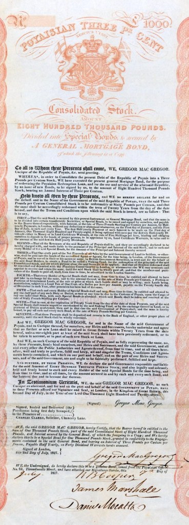 Left: Poyais stock certificate, part of an £800,000 loan package, 1827