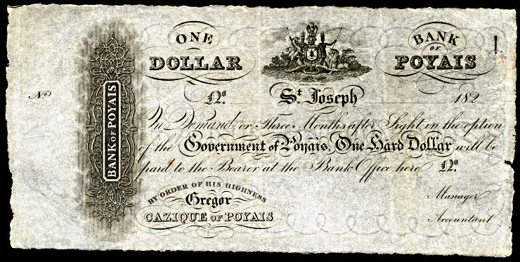 The Cazique of Poyais set about recruiting settlers and investors, raising a dizzying £200,000, a sum equivalent to nearly 12 million, today. Settlers were invited to exchange their pounds sterling for Poyais dollars, the notes conveniently printed by none other, than Gregor MacGregor.