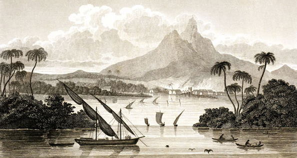 Woodcut depicting the non-existent “Black River Port”, of Poyais
