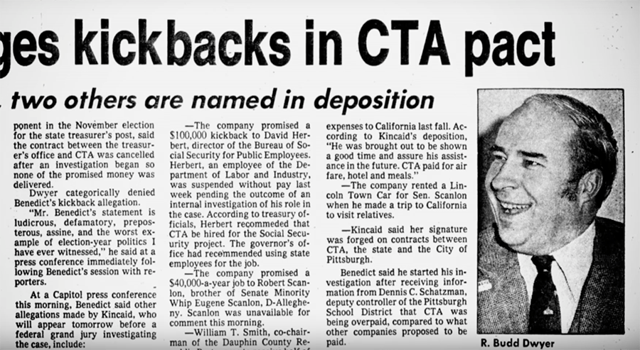 Governor Dick Thornburg received an anonymous memo a few weeks later, alleging bribery in the award of the CTA contract. R. Budd Dwyer was named as one of the people receiving kickbacks in the deal along with Republican committee member Bob Asher, and CTA attorney William ‘Bill’ Smith.