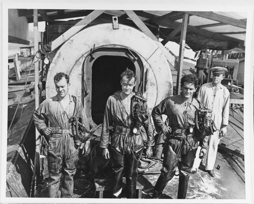 Divers standing in front of a decompression chamber, while they were working to salvage ships sunk in the 7 December 1941 Japanese air raid on Pearl Harbor. Note warrant officer standing at right. Official U.S. Navy Photograph, from the collections of the Naval History and Heritage Command.