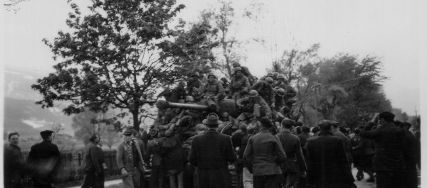 French and Belgian soldiers as well as civillians shake the hands and greet Yanks entering Innsbruck 824th TD
